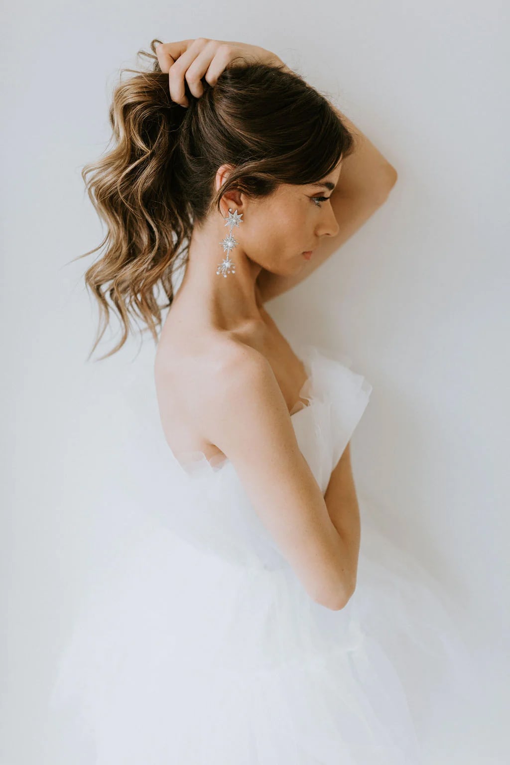 幾つものパールと繊細なクリスタルでかたどられた美しい星モチーフのこちらのイヤリングは、他にはなかなか見ないデザインで、少しカジュアルな抜け感を好まれる花嫁様にピッタリです。